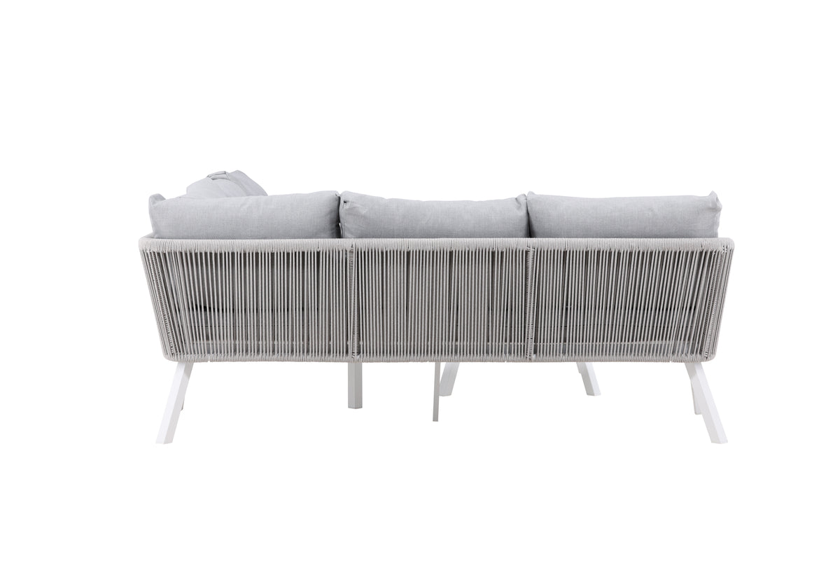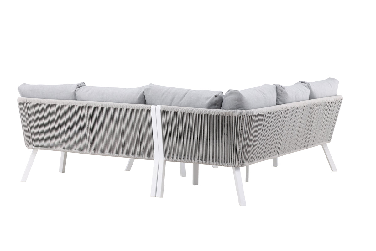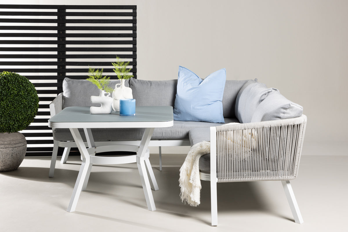 Virya sofasæt er et flot og stilrent sæt i hvid aluminium med tilhørende bord med glasplade. Slidstærke grå hynder medfølger, og sættet har plads til i alt 5 siddende gæster.