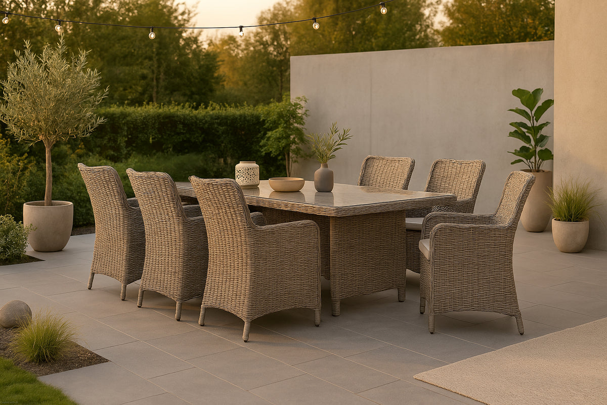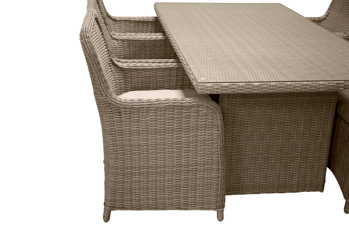 Et spisesæt med et rektangulært spisebord i kunstig rattan og en bordplade af glas. I spisesættet medfølger seks komfortable armstole.