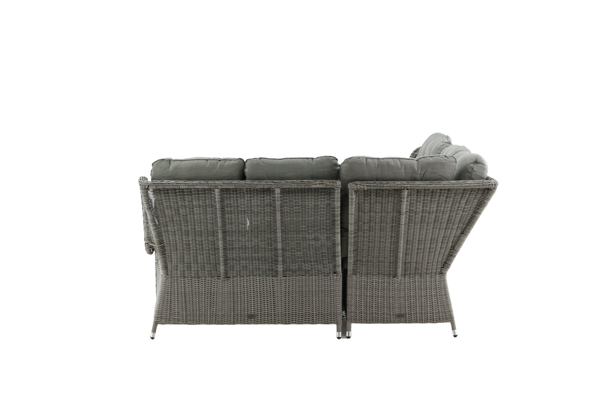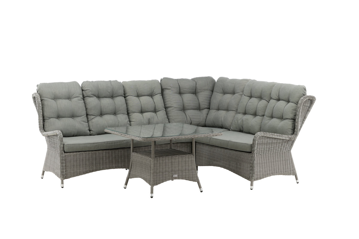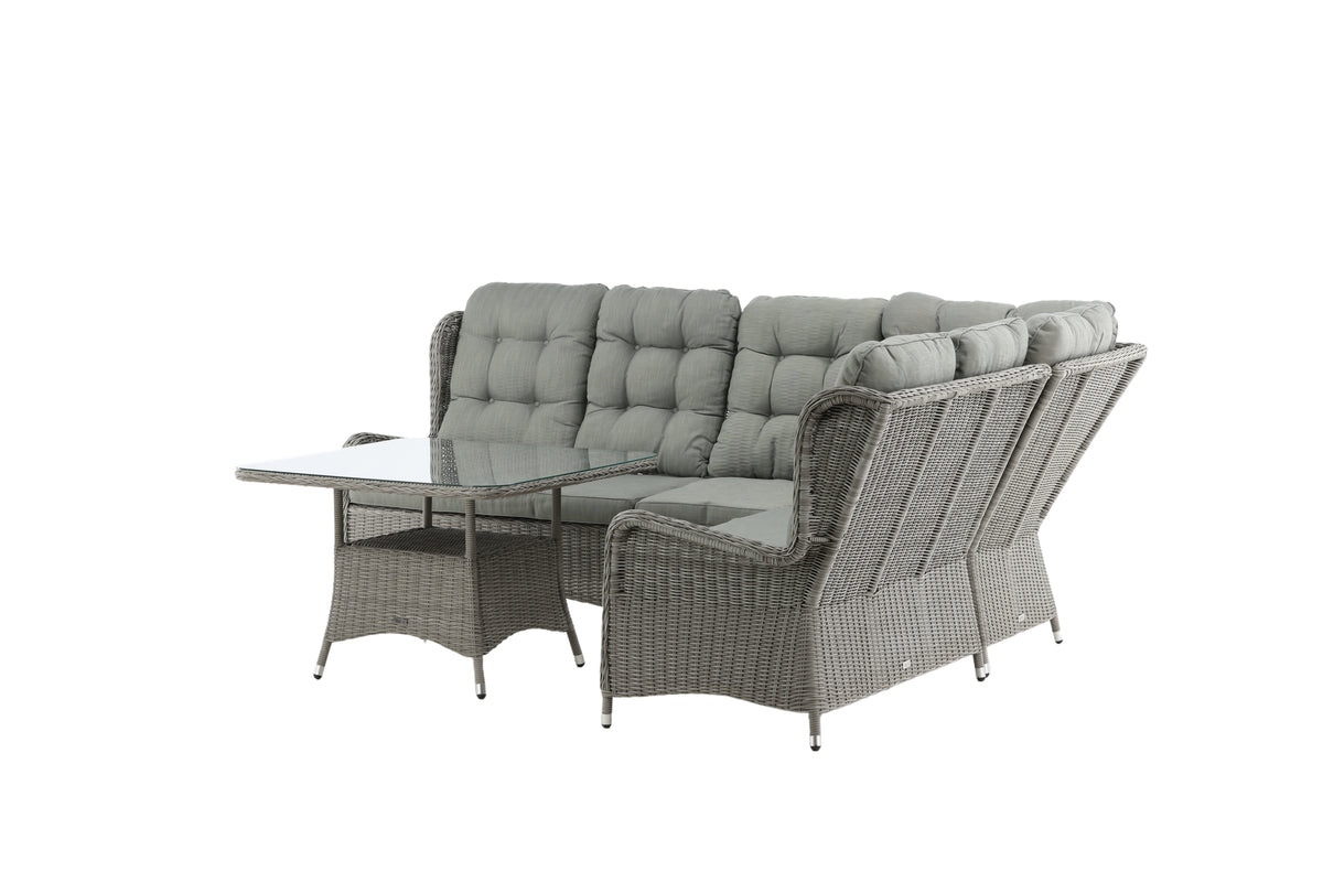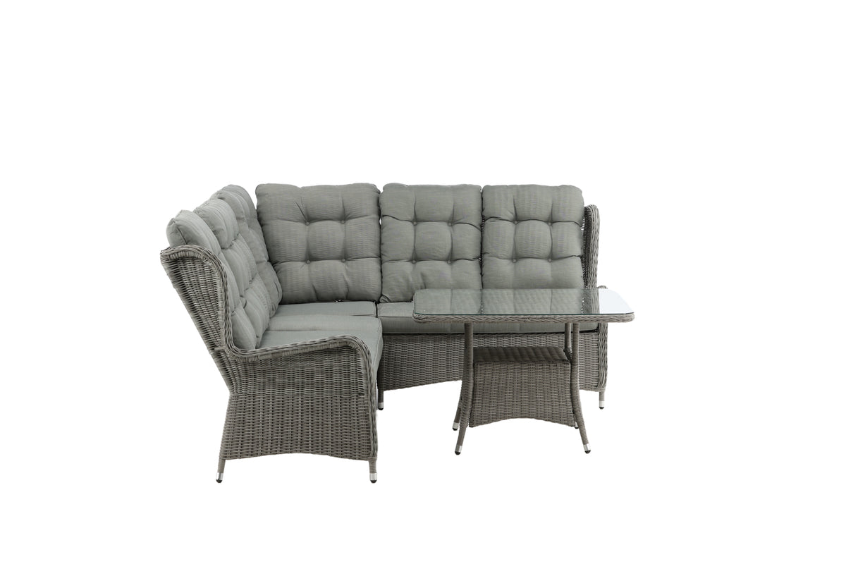 Washington er et eksklusivt loungesæt med en kombination af tidløst design og fantastisk komfort – det vil helt sikkert blive et hit på din terrasse i sommer. Sofagruppe består af en hjørnesofa med 6 pladser og et hjørneelement samt et højere sofabord med reliefhylde og glasbordplade. Fremstillet af lys grå kunstflet med aluminiumsramme. Bløde, tykke, lysgrå hynder er inkluderet til sofagruppen. Nyd sene sommeraftener på bedste vis!