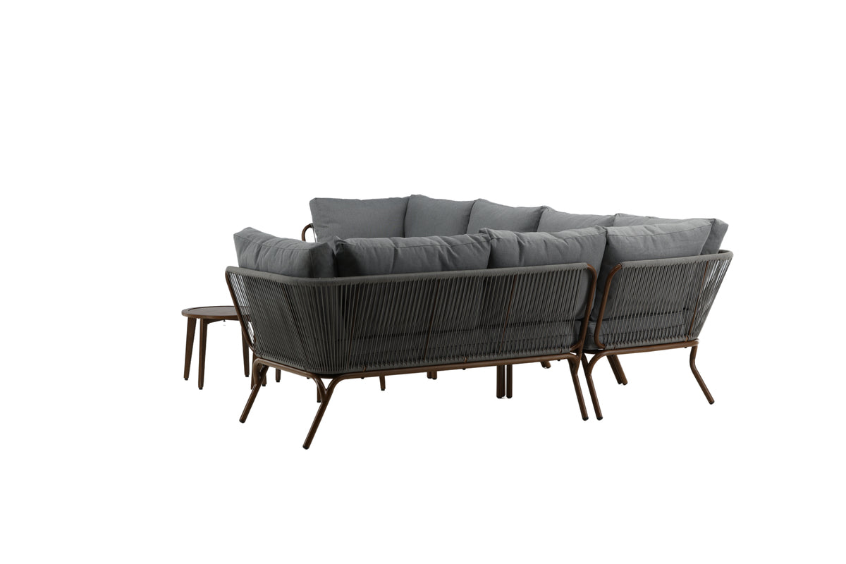 Skab et hyggeligt sted at samle dine kære denne sommer – her sidder du afslappet og behageligt i timevis! Roxo er en trendy sofagruppe i stilrent design, perfekt til terrassen eller uderummet. Sofagruppen består af en hjørnesofa med fem siddepladser og et hjørnemodul, fremstillet i et slidstærkt design af brunt, pulverlakeret metal med ryg i lysegrå reb og et stilfuldt sæt af tre matchende borde i brunt lakeret træ. Bløde grå hynder medfølger til sofagruppen!