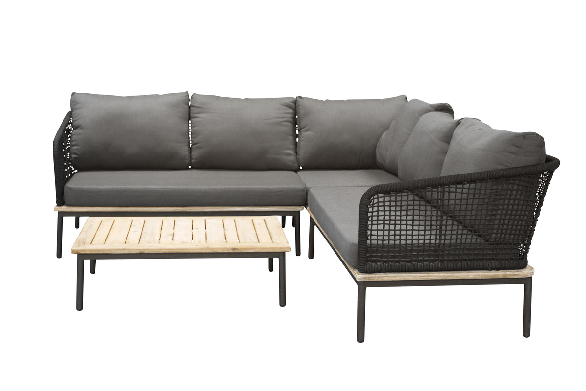 Andorra – en flot og stilfuld sofagruppe i moderne design. Sofagruppen består af en hjørnesofa lavet af en sort pulverlakeret metalramme med stilfulde detaljer i akacietræ og en ryg i sort reb, inklusiv bløde, tykke mørkegrå puder, samt et lavt, stilfuldt sofabord med bordplade i akacietræ og understel i samme design som hjørnesofaen. Sammen skaber de en smuk helhed!