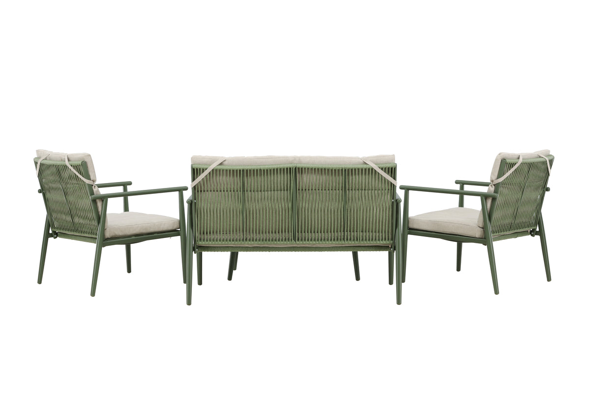 Mazzaro er sofagruppen, der kombinerer stil og komfort for et harmonisk udendørsmiljø. Med sin elegante og unikke grønne stålramme bliver dette sæt et iøjnefaldende element på terrassen, samtidig med at det tilbyder et let og luftigt design. Sættet består af en sofa, to komfortable lænestole og et lille rektangulært bord – alt, hvad du behøver for at skabe det perfekte rum til at nyde udendørslivet med venner og familie. De beige puder i polyesterstof giver en blød kontrast til den grønne ramme og fremhæver det stilrene indtryk. Mazzaro er lige velegnet til en afslappende kaffepause som til festlige lejligheder på sommeraftener. Dette kompakte sæt passer nemt ind i dit udendørsmiljø og kombinerer design med funktionalitet. Skab en indbydende atmosfære med Mazzaro-sofagruppen – hvor elegance og komfort mødes i perfekt balance.