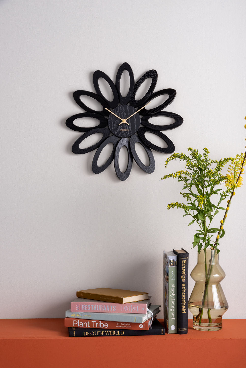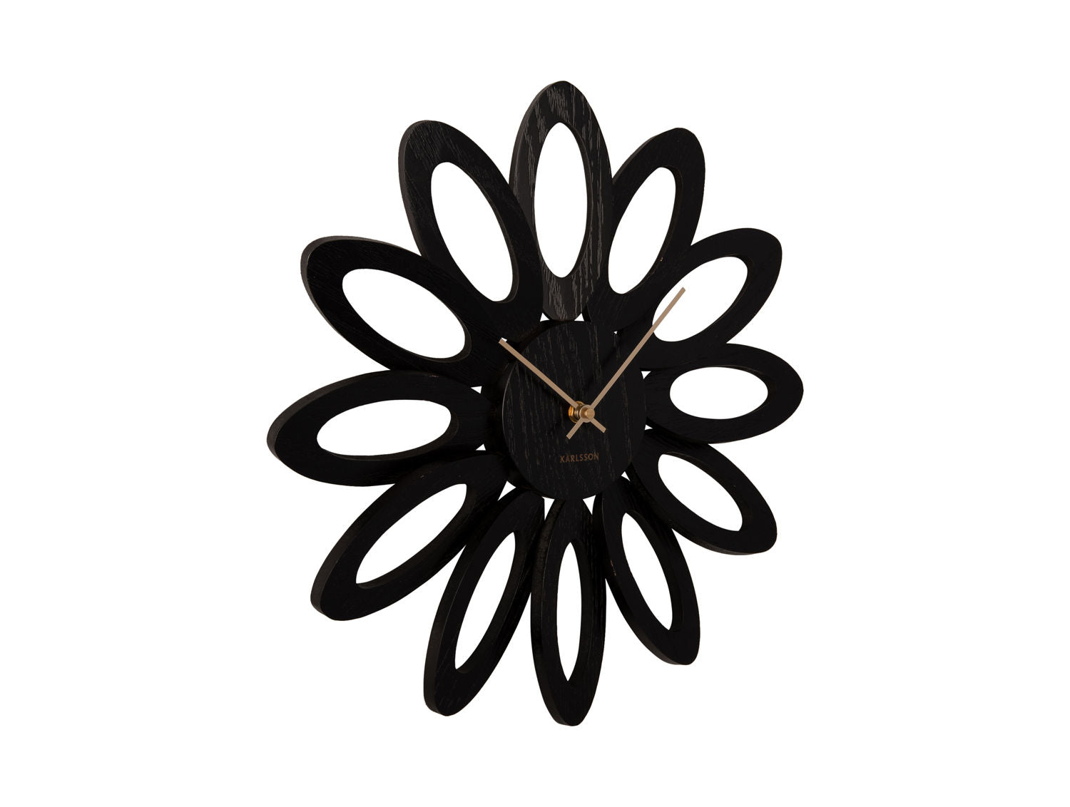 Fiore-væguret fra Karlsson fås i sort eller mørkt træfinér.